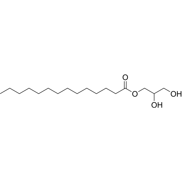 据报道,2,3-二羟丙基十四烷酸酯存在于维罗尼气单胞菌和秀丽隐杆线虫中,并有相关数据。 - 化合物背景:1-单肉豆蔻酸(单肉豆蔻酸)是一种天然存在的单酰甘油化合物。其分子结构由一个甘油分子和一个通过酯键连接的肉豆蔻酸(十四烷酸)组成。在参考文献[3]中,该化合物被用作母体结构合成了一系列衍生物,并且其本身也被评估为一种潜在的抗菌和抗真菌剂[3]。 - 作用机制推测:基于1-单诺米瑞汀的化学结构及其抗菌/抗真菌活性结果,参考文献[3]推测其作用机制可能与破坏细菌或真菌细胞膜的完整性有关。据推测,该化合物插入细胞膜的脂质双层,改变膜的流动性和通透性,导致细胞内容物泄漏,最终导致微生物死亡。然而,这一机制尚未得到进一步实验的验证[3]。 |