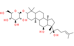 (20S)-人参皂苷Rh2是一种存在于人参属植物中的人参皂苷,其结构为达玛烷型人参皂苷,在3β、12β和20位(pro-S位)被羟基取代。其中,3位羟基转化为相应的β-D-吡喃葡萄糖苷,并在24-25位引入双键。它具有多种植物代谢产物、抗肿瘤剂、细胞凋亡诱导剂、心脏保护剂、骨密度维持剂和肝脏保护剂的作用。它是一种β-D-葡萄糖苷、12β-羟基甾醇、人参皂苷、四环三萜类化合物和20-羟基甾醇。它来源于达玛烷的氢化物。