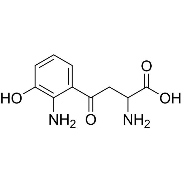 3-羟基犬尿氨酸诱导的神经元细胞死亡表现出许多细胞凋亡特征 [1]。 3-羟基犬尿氨酸是主要色氨酸 (Trp) 代谢途径(犬尿氨酸途径)的副产物 [1]。 3. 在病理情况下,3-羟基犬尿氨酸在大脑中发挥内源性神经毒性作用[1]。 3-羟基犬尿氨酸 (20-100 μM) 的 IC50 约为 70 μM,以剂量依赖性方式强烈抑制 CD4+ T 细胞增殖[2]。 3. 羟基犬尿氨酸 (20–100 μM) 以剂量依赖性方式诱导显着的 CD4+ T 细胞介导的细胞死亡 [2]。