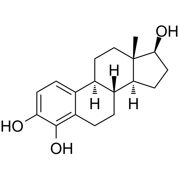 4-羟基-17β-雌二醇是一种4-羟基类固醇,由17β-雌二醇在4位碳原子上额外添加一个羟基构成。它是一种代谢产物,在功能上与17β-雌二醇相关。已有报道称,4-羟基雌二醇存在于人类体内,并有相关数据。4-羟基雌二醇是17β-雌二醇代谢过程中,经细胞色素P450 1B1对4位碳原子进行羟基化而形成的代谢产物,具有潜在的致癌活性。4-羟基雌二醇(4-OHE2)的促肿瘤作用机制尚未完全阐明,但该代谢产物与其氧化醌式形式——雌二醇3,4-醌——进行代谢氧化还原循环,并产生活性氧(ROS),进而诱导氧化性DNA损伤。 4-OHE2 还能激活核因子-κB (NF-κB) 和细胞外信号调节激酶/丝裂原活化蛋白激酶通路,并通过激活雌激素受体 (ER) 诱导某些基因的表达,从而刺激易感细胞的增殖。