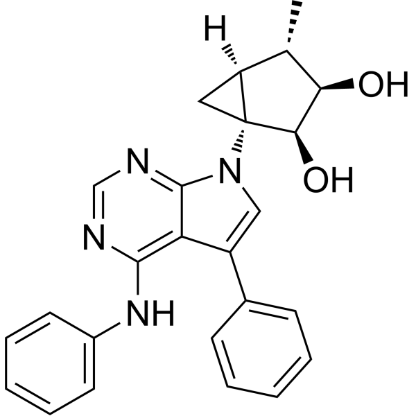 5-Iodotubercidin (NSC 113939) 的 IC50 值分别为 0.4、3.5、5-10、5-10、10.9 和 27.7 μM,并抑制 CK1、胰岛素受体酪氨酸激酶、磷酸化酶激酶、PKA、CK2 和 PKC[ 1]。 5-碘结核菌素 (20 μM) 导致 ATP 浓度显着下降,而 AMP 浓度相应略有增加。 5. 碘结核菌素降低脂肪酸和胆固醇的合成速率以及ACC的活性。 5-碘结核菌素显着降低细胞内丙二酰辅酶A的浓度,这与碘结核菌素介导的ACC抑制作用一致[4]。