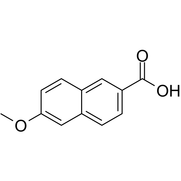 6-甲氧基-2-萘甲酸是一种合成的小分子化合物,被归类为NMDA受体的选择性负调节剂[1]。 其作用机制涉及与NMDA受体的变构位点(不同于谷氨酸或甘氨酸的结合位点)结合,从而抑制谷氨酸和甘氨酸诱导的受体激活。这种变构调节赋予其对NR1/NR2A和NR1/NR2B受体的亚型选择性[1]。 基于其对NMDA受体的抑制活性和体外低细胞毒性,该化合物被认为具有治疗NMDA受体过度激活相关疾病(例如神经退行性疾病、癫痫和缺血性脑损伤)的潜在用途[1]。 |
