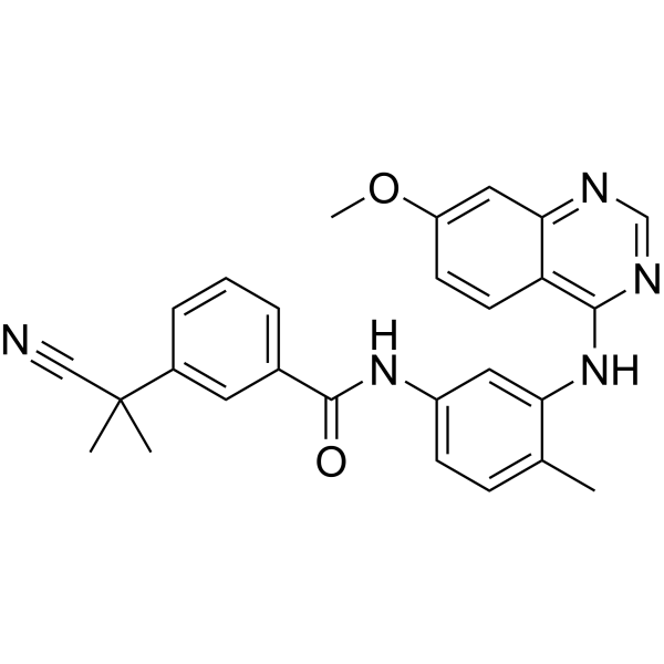 InChI=1S/C27H25N5O2/c1-17-8-9-20(31-26(33)18-6-5-7-19(12-18)27(2,3)15-28)13-23(17)32-25-22-11-10-21(34-4)14-24(22)29-16-30-25/h5-14,16H,1-4H3,(H,31,33)(H,29,30,32)