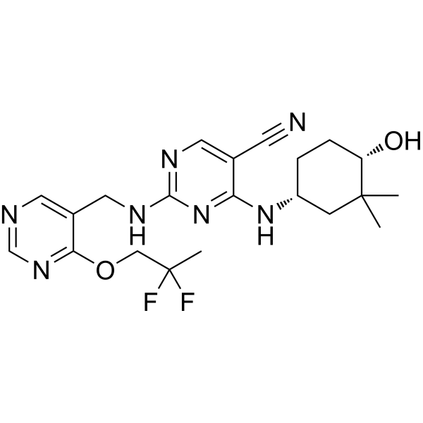 InChI=1S/C21H27F2N7O2/c1-20(2)6-15(4-5-16(20)31)29-17-13(7-24)9-26-19(30-17)27-10-14-8-25-12-28-18(14)32-11-21(3,22)23/h8-9,12,15-16,31H,4-6,10-11H2,1-3H3,(H2,26,27,29,30)/t15-,16+/m1/s1