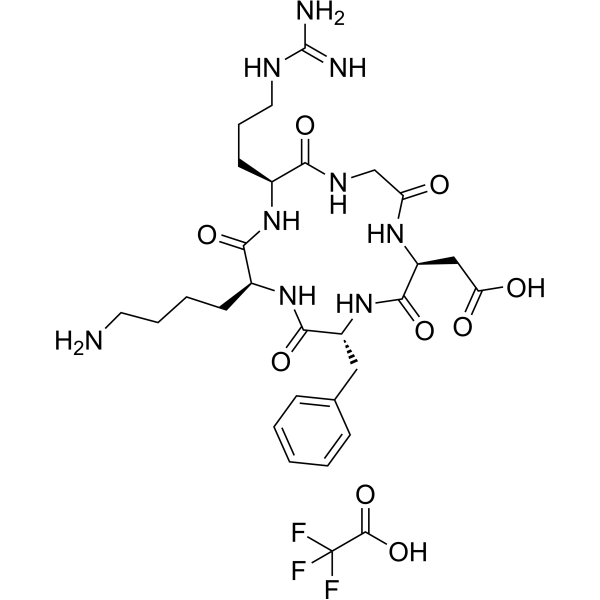 500577-51-5; Cyclo(-RGDfK) Trifluoroacetate; Cyclo(L-arginylglycyl-L-a-aspartyl-D-phenylalanyl-L-lysyl),mono(trifluoroacetate); Cyclo (-RGDfK); Cyclo(-RGDfK) (TFA); 2-[(2S,5R,8S,11S)-8-(4-aminobutyl)-5-benzyl-11-[3-(diaminomethylideneamino)propyl]-3,6,9,12,15-pentaoxo-1,4,7,10,13-pentazacyclopentadec-2-yl]acetic acid;2,2,2-trifluoroacetic acid; 2-((2S,5R,8S,11S)-8-(4-Aminobutyl)-5-benzyl-11-(3-guanidinopropyl)-3,6,9,12,15-pentaoxo-1,4,7,10,13-pentaazacyclopentadecan-2-yl)acetic acid Trifluoroacetate (1:1); Cyclo (-RGDfK) 2,2,2-Trifluoroacetic acid;