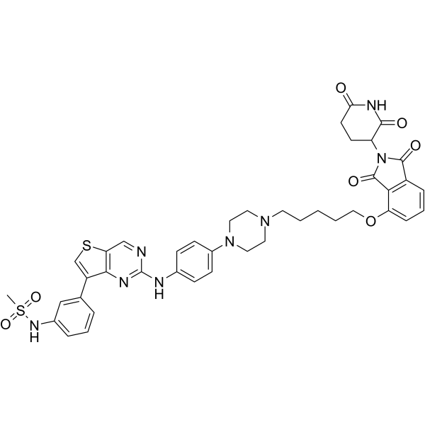 InChI=1S/C41H42N8O7S2/c1-58(54,55)46-28-8-5-7-26(23-28)31-25-57-34-24-42-41(45-37(31)34)43-27-11-13-29(14-12-27)48-20-18-47(19-21-48)17-3-2-4-22-56-33-10-6-9-30-36(33)40(53)49(39(30)52)32-15-16-35(50)44-38(32)51/h5-14,23-25,32,46H,2-4,15-22H2,1H3,(H,42,43,45)(H,44,50,51)