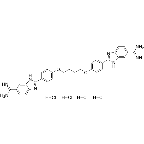 InChI=1S/C32H30N8O2.4ClH/c33-29(34)21-7-13-25-27(17-21)39-31(37-25)19-3-9-23(10-4-19)41-15-1-2-16-42-24-11-5-20(6-12-24)32-38-26-14-8-22(30(35)36)18-28(26)40-32;;;;/h3-14,17-18H,1-2,15-16H2,(H3,33,34)(H3,35,36)(H,37,39)(H,38,40);4*1H