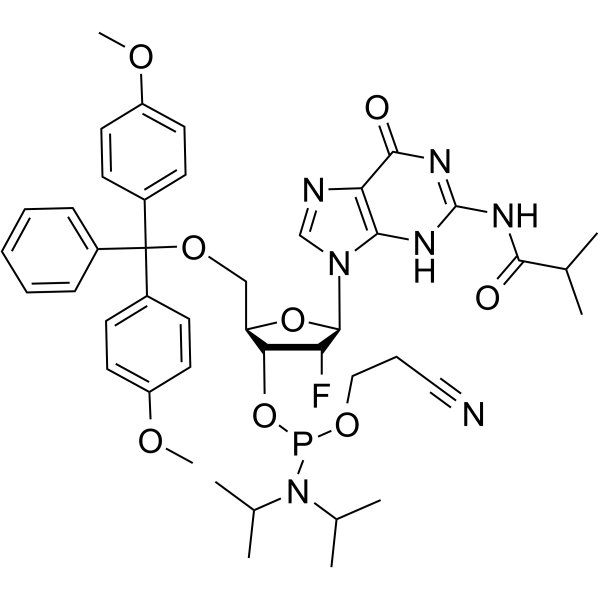 InChI=1S/C44H53FN7O8P/c1-27(2)40(53)49-43-48-39-37(41(54)50-43)47-26-51(39)42-36(45)38(60-61(58-24-12-23-46)52(28(3)4)29(5)6)35(59-42)25-57-44(30-13-10-9-11-14-30,31-15-19-33(55-7)20-16-31)32-17-21-34(56-8)22-18-32/h9-11,13-22,26-29,35-36,38,42H,12,24-25H2,1-8H3,(H2,48,49,50,53,54)/t35-,36-,38-,42-,61?/m1/s1