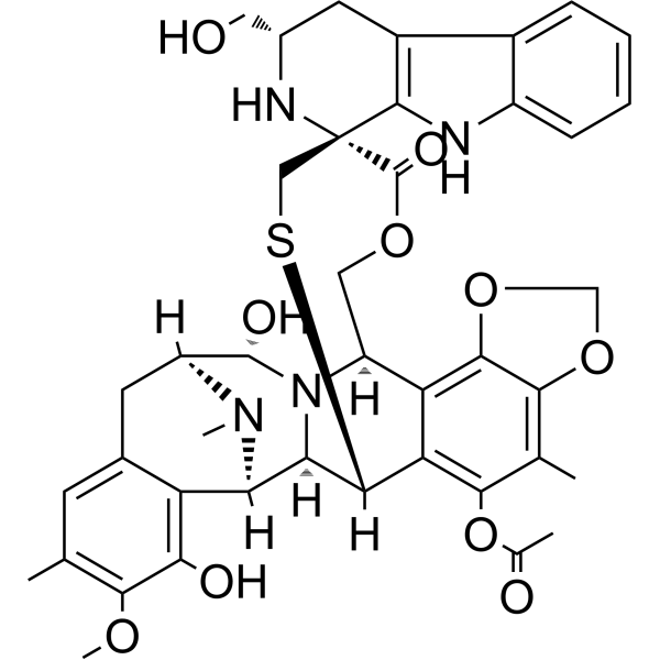 InChI=1S/C41H44N4O10S/c1-17-10-20-11-25-39(49)45-26-14-52-40(50)41(38-23(12-21(13-46)43-41)22-8-6-7-9-24(22)42-38)15-56-37(31(45)30(44(25)4)27(20)32(48)33(17)51-5)29-28(26)36-35(53-16-54-36)18(2)34(29)55-19(3)47/h6-10,21,25-26,30-31,37,39,42-43,46,48-49H,11-16H2,1-5H3/t21-,25-,26-,30+,31+,37+,39-,41+/m0/s1