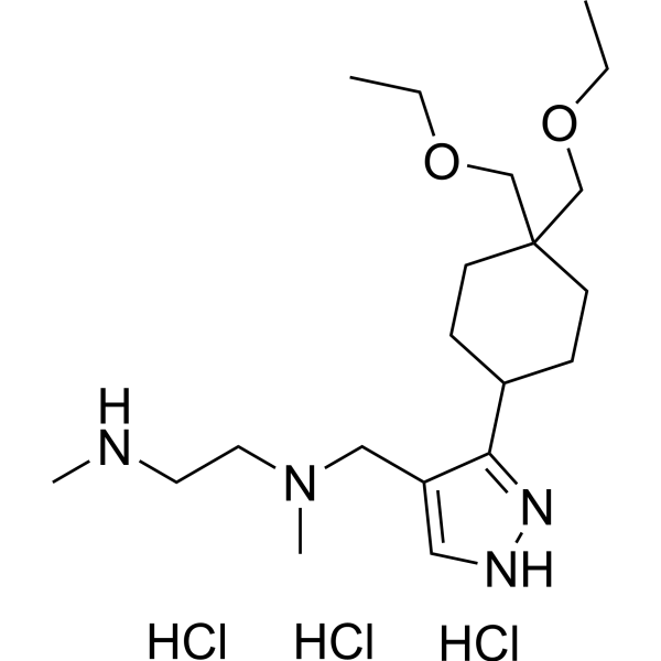 Cl[H].Cl[H].Cl[H].O(C([H])([H])C([H])([H])[H])C([H])([H])C1(C([H])([H])OC([H])([H])C([H])([H])[H])C([H])([H])C([H])([H])C([H])(C2=C(C([H])=NN2[H])C([H])([H])N(C([H])([H])[H])C([H])([H])C([H])([H])N([H])C([H])([H])[H])C([H])([H])C1([H])[H]