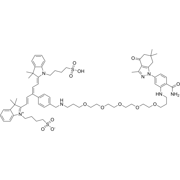 CC1=NN(C2=C1C(=O)CC(C2)(C)C)C3=CC(=C(C=C3)C(=O)N)NCCCOCCOCCOCCOCCOCCCNCC4=CC=C(C=C4)/C(=C/C=C/5\C(C6=CC=CC=C6N5CCCCS(=O)(=O)[O-])(C)C)/C=C/C7=[N+](C8=CC=CC=C8C7(C)C)CCCCS(=O)(=O)O