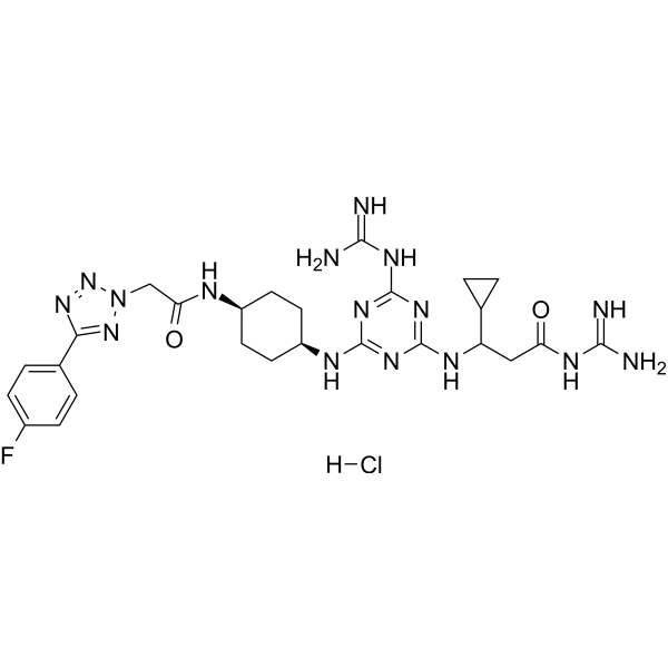 3-cyclopropyl-N-(diaminomethylidene)-3-[[4-(diaminomethylideneamino)-6-[[4-[[2-[5-(4-fluorophenyl)tetrazol-2-yl]acetyl]amino]cyclohexyl]amino]-1,3,5-triazin-2-yl]amino]propanamide;hydrochloride