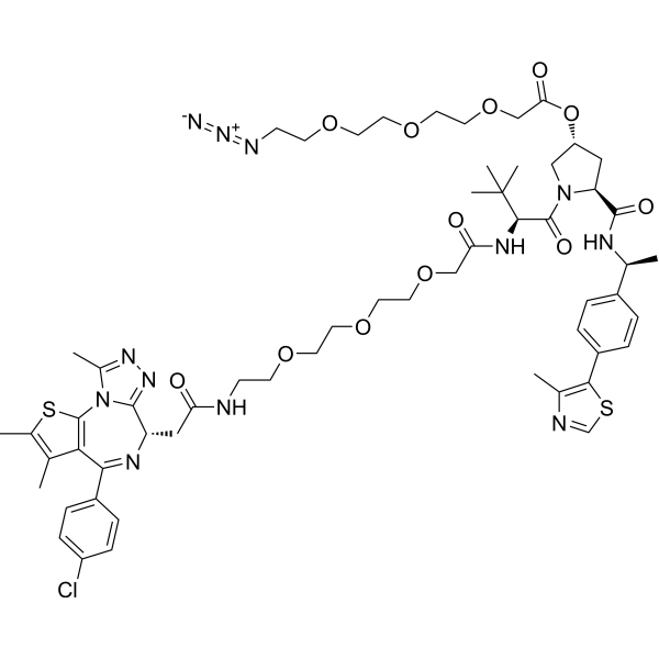 InChI=1S/C58H75ClN12O12S2/c1-35-38(4)85-57-50(35)51(41-13-15-43(59)16-14-41)65-45(54-68-67-39(5)71(54)57)30-47(72)61-17-19-77-21-23-79-25-27-81-32-48(73)66-53(58(6,7)8)56(76)70-31-44(83-49(74)33-82-28-26-80-24-22-78-20-18-63-69-60)29-46(70)55(75)64-36(2)40-9-11-42(12-10-40)52-37(3)62-34-84-52/h9-16,34,36,44-46,53H,17-33H2,1-8H3,(H,61,72)(H,64,75)(H,66,73)/t36-,44+,45-,46-,53+/m0/s1