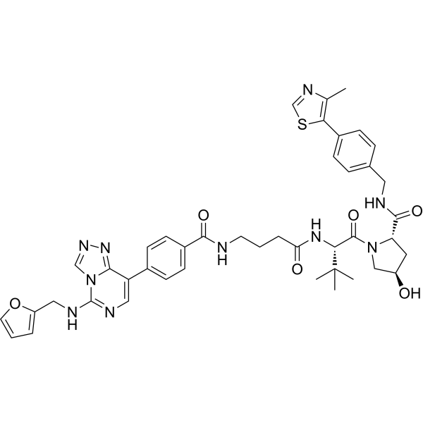 CC1=C(SC=N1)C2=CC=C(C=C2)CNC(=O)[C@@H]3C[C@H](CN3C(=O)[C@H](C(C)(C)C)NC(=O)CCCNC(=O)C4=CC=C(C=C4)C5=CN=C(N6C5=NN=C6)NCC7=CC=CO7)O