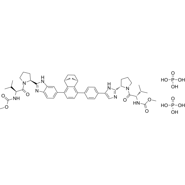 InChI=1S/C49H58N8O6.2H3O4P/c1-26(2)42(54-48(60)62-5)46(58)56-21-7-9-38(56)44-50-25-37(53-44)29-13-11-28(12-14-29)33-18-19-34(41-32-16-15-31(23-32)40(33)41)30-17-20-35-36(24-30)52-45(51-35)39-10-8-22-57(39)47(59)43(27(3)4)55-49(61)63-6;2*1-5(2,3)4/h11-14,17-20,24-27,31-32,38-39,42-43H,7-10,15-16,21-23H2,1-6H3,(H,50,53)(H,51,52)(H,54,60)(H,55,61);2*(H3,1,2,3,4)/t31-,32+,38+,39+,42+,43+;;/m1../s1