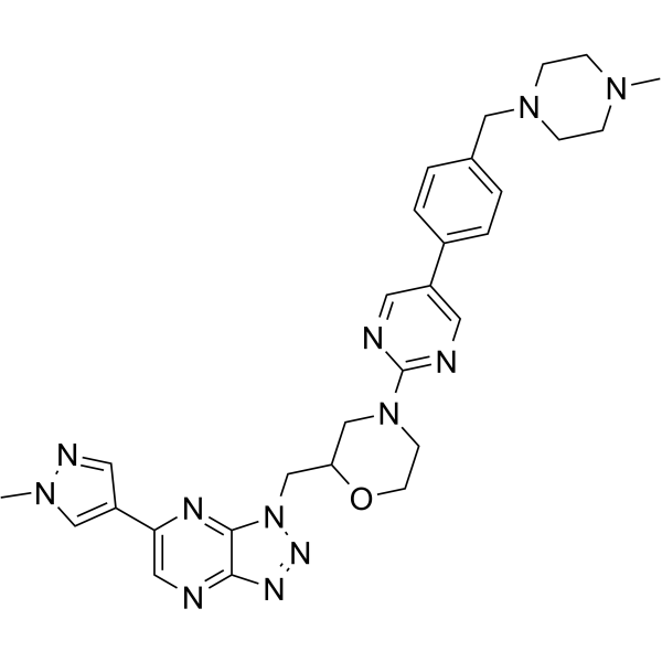 InChI=1S/C29H34N12O/c1-37-7-9-39(10-8-37)17-21-3-5-22(6-4-21)23-13-31-29(32-14-23)40-11-12-42-25(19-40)20-41-28-27(35-36-41)30-16-26(34-28)24-15-33-38(2)18-24/h3-6,13-16,18,25H,7-12,17,19-20H2,1-2H3