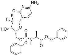 C[C@@H](C(=O)OCC1=CC=CC=C1)NP(=O)(OC[C@@H]2[C@H](C([C@@H](O2)N3C=CC(=NC3=O)N)(F)F)O)OC4=CC=CC=C4