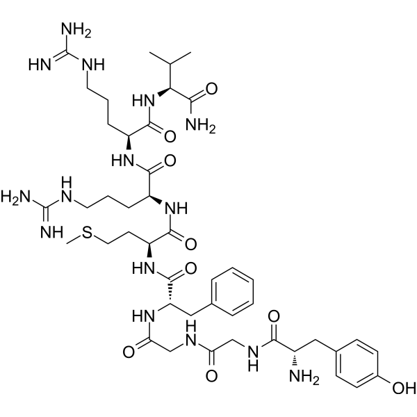 Adrenorphin (Metorphamide) 是一种源自牛脑的阿片类八肽,是 μ-阿片受体的强激动剂,Ki 为 12 nM。 μ-阿片受体的 Ki/δ-阿片受体的 Ki 为 0.04,而 μ-阿片受体的 Ki/κ-阿片受体的 Ki 为 0.46[1]。在培养的人嗜铬细胞瘤 6 细胞中,肾上腺素可有效抑制 10 μM 尼古丁诱导的儿茶酚胺产生,IC50 为 1.1 μM [2]。