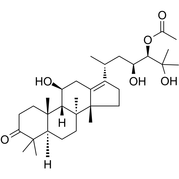 24-乙酸泽泻酯是从传统中药泽泻(泽泻的干燥根茎)中分离得到的主要原甾烷型三萜类化合物。 据报道,它具有利尿、抗炎和降胆固醇作用。 本研究建立的液相色谱-质谱联用方法首次报道了口服泽泻提取物后大鼠血浆中24-乙酸泽泻酯和24-乙酸泽泻酯的同时测定。 [1] 泽泻醇A 24-乙酸酯是从传统中药泽泻(Alisma orientalis)中分离得到的主要原甾烷型三萜类化合物。 该化合物在多种溶剂中不稳定。 在质子溶剂(例如甲醇、乙醇)中,泽泻醇A 24-乙酸酯会发生快速的乙酰基迁移,转化为其异构体泽泻醇A 23-乙酸酯。 在质子溶剂中的转化速率比在非质子溶剂(例如丙酮、乙腈、乙酸乙酯、氯仿)中更快。 当在甲醇中长期储存(例如超过14天)时,泽泻醇A 24-乙酸酯和泽泻醇A 23-乙酸酯会进一步脱乙酰基生成泽泻醇A。 单晶X射线衍射结构Alisol A 24-乙酸酯的结构已确定,并证实了其构型。A环和B环呈扭船式构象,C环呈椅式构象,D环呈信封式构象。A/B环和B/C环的连接处为反式连接。 该研究首次报道了Alisol A 24-乙酸酯、Alisol A 23-乙酸酯和Alisol A之间的结构相互转化,并首次解析了Alisol A 24-乙酸酯的单晶X射线衍射结构。[2] |