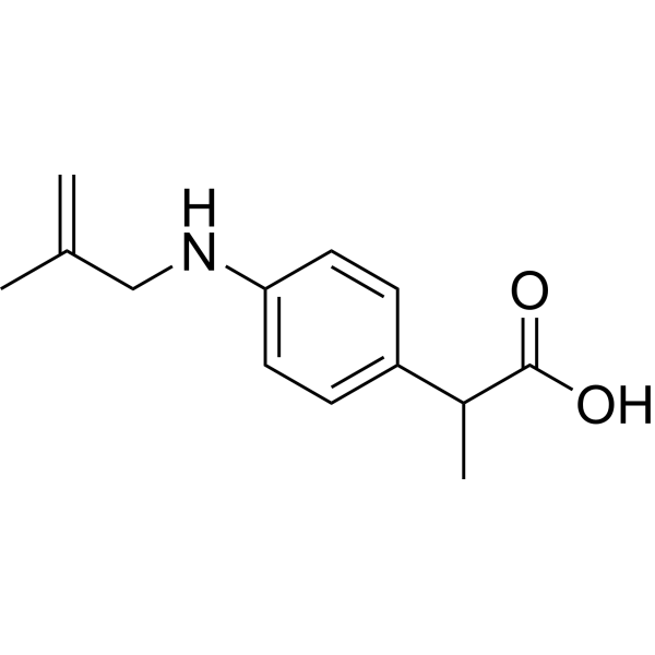 阿米诺洛芬是一种取代苯胺,是布洛芬中异丁基被(2-甲基丙-2-烯-1-基)氨基取代的化合物。它是一种非甾体类抗炎药,用于治疗炎症和风湿性疾病。它具有多种药理活性,包括非甾体抗炎药、抗风湿药、解热药、EC 1.13.11.34(花生四烯酸5-脂氧合酶)抑制剂、EC 3.1.1.4(磷脂酶A2)抑制剂、环氧合酶2抑制剂和非麻醉性镇痛药。它是一种单羧酸、取代苯胺、氨基酸和仲胺化合物。