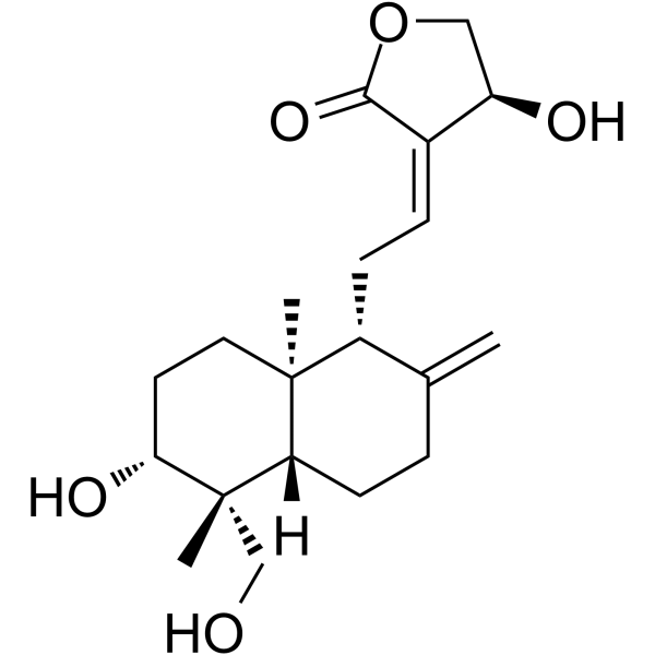 Androanolide 对 LNCaP、HepG2、KB、MCF7 和 SK-Mel2 等癌细胞具有细胞毒性,IC50 值在 31.8 至 45.9 µM 之间变化 [1]。在脂多糖 (LPS) 刺激的 RAW264.7 巨噬细胞中,androanolide 的 IC50 为 13.4 µM,可大大减少一氧化氮 (NO) 的过量产生 [1]。