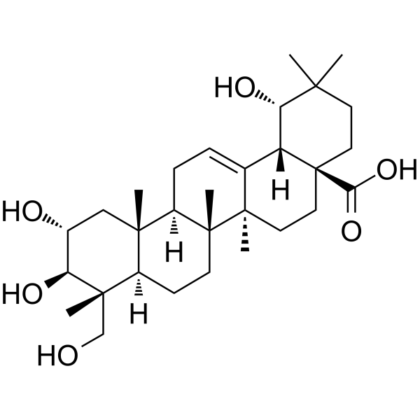 另见:诃子(Terminalia chebula)果实(部分)。 - 分离来源及方法:阿琼苷元是一种新的三萜化合物,首次从诃子(Terminalia arjuna)中分离得到。分离过程包括用乙醇提取诃子干燥的树皮;然后将乙醇提取物浓缩,并用氯仿和水进行萃取。将氯仿可溶部分进行硅胶柱色谱分离,采用氯仿和甲醇的混合物进行梯度洗脱。根据薄层色谱 (TLC) 分析收集含有阿琼苷元 (Arjungenin) 的馏分,并用合适的有机溶剂重结晶进一步纯化,得到纯的白色结晶固体阿琼苷元 [1]。 - 化学结构表征:采用多种光谱技术确定阿琼苷元的化学结构。元素分析确定其分子式为 C₃₀H₄₆O₄。红外 (IR) 光谱显示羟基 (3400 cm⁻¹) 和羰基 (1720 cm⁻¹) 的吸收峰,表明存在这些官能团。核磁共振(NMR)光谱(¹H-NMR 和 ¹³C-NMR)进一步证实了三萜骨架结构,其特征信号分别归属于甲基、烯烃质子和含氧碳,最终确认其为一种新的三萜衍生物[1] |