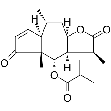 - Arnicolide D 溶于 DMSO,并用生理盐水稀释(最终 DMSO 浓度 ≤ 0.5%)。治疗组每 3 天腹腔注射一次,持续 4 周;载体组注射等体积的载体[1] - 每 3 天测量一次肿瘤体积(体积 = 长 × 宽² / 2)。治疗结束后,处死小鼠,称量肿瘤重量。收集肿瘤组织进行TUNEL检测、免疫组织化学(Ki-67)和蛋白质印迹分析[1] |