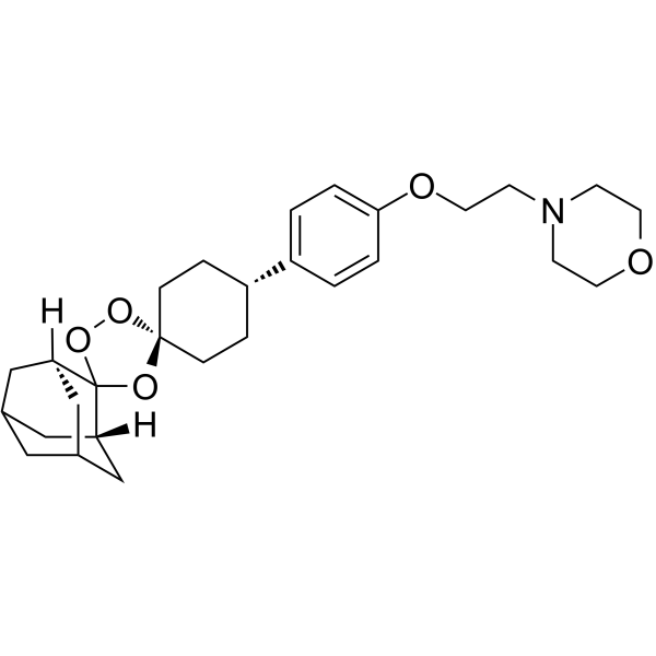 来自恶性疟原虫的蛋白质被 artefenomel (OZ439) 烷基化(10 μg/mL,2 小时)[1]。在剂量高达 300 μM 时,artefenomel (0.3-300 μM) 会以剂量依赖性方式降低 Vero 细胞中 ACE2 的表达,而不会引起任何细胞毒性 [2]。 artefenomel (33-100 μM) 的 IC50 为 2.9 μM,以剂量依赖性方式抑制 SARS-CoV-2,并完全消除病毒诱导的 CPE [2]。在怀孕的 Crl:CD(SD)BR 大鼠胚胎中,artefenomel (0–10 µg/mL) 会损害红细胞并引起贫血,从而导致组织学改变(细胞死亡)和宏观异常 [3]。