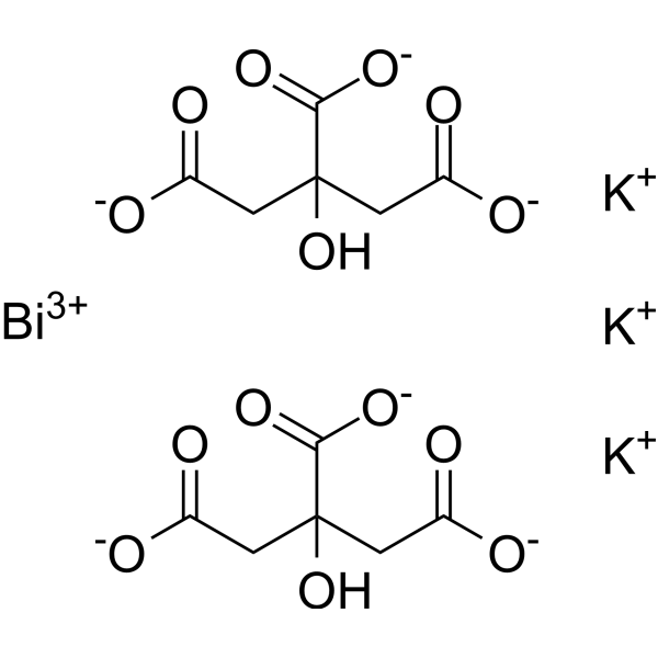 次柠檬酸铋是一种矿物化合物,用于治疗由幽门螺杆菌引起的十二指肠溃疡和胃溃疡。 次柠檬酸铋钾是一种可溶性复合铋盐,与甲硝唑和四环素联合使用,用于治疗由幽门螺杆菌感染引起的胃溃疡。 药物适应症 用于治疗消化性溃疡和胃食管反流病 (GORD)。用于治疗胃和十二指肠黏膜的炎症和糜烂性溃疡性疾病:胃炎、胃和十二指肠溃疡、功能性非溃疡性消化不良、糜烂性十二指肠炎、术后炎症和糜烂性改变——吻合口炎、吻合口消化性溃疡 作用机制 胶体次柠檬酸铋在治疗胃十二指肠疾病方面非常有效,其作用机制似乎有多种。它几乎没有中和酸的作用,也不影响胃酸分泌。目前尚不确定它是否影响胃蛋白酶的分泌,但它确实能抑制胃蛋白酶的活性。它能增加黏液糖蛋白的分泌,并且可能与胃黏液层结合,从而起到阻止盐酸扩散的作用。它能加速溃疡愈合,并导致表皮生长因子在溃疡周围积聚。此外,它还具有细胞保护作用,并能增加黏膜前列腺素和碳酸氢盐的分泌。它对幽门螺杆菌(与胃炎和消化性溃疡相关)具有杀菌作用。它还能阻止幽门螺杆菌黏附于上皮细胞,并能抑制幽门螺杆菌分泌的酶,例如蛋白酶、脂肪酶、糖苷酶和磷脂酶。 药效学 枸橼酸铋在治疗胃十二指肠疾病方面非常有效,其作用机制似乎有多种。它几乎没有中和酸的作用,也不影响胃酸分泌。 |