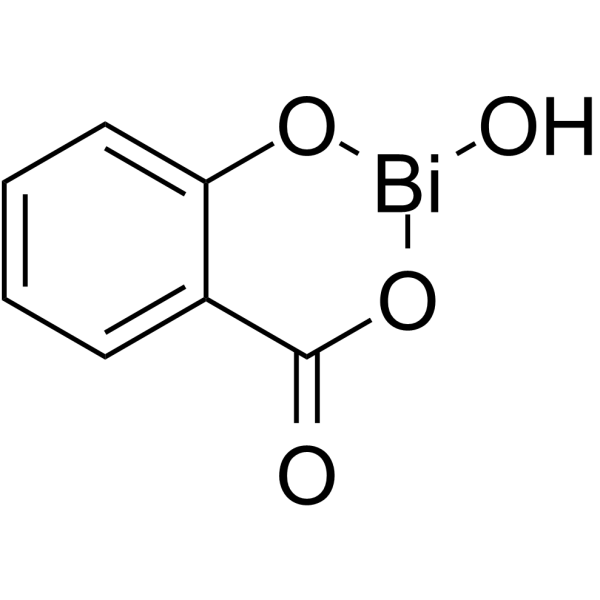 Used as an intestinal absorbent. Veterinary Uses: Antidiarrheal. It has a weak intestinal disinfectant effect due to the release of salicylic acid. It is usually used in combination with carbonates to minimize the irritation of free acid while utilizing the protective effect of bismuth. CMPD is sometimes used orally to relieve diarrhea or soothe gastritis or peptic ulcers. Before the advent of penicillin, bismuth subsalicylate was widely used to treat syphilis… /SRP: Formerly/Treatment of Vincent's pharyngitis, syphilis For more complete data on the therapeutic uses of bismuth subsalicylate (7 types), please visit the HSDB records page. Drug Warnings Even in cases of widespread use, gradual intramuscular injection therapy for the treatment of syphilis rarely results in serious poisoning. Treatment is usually discontinued if gingivitis, proteinuria, rash, or significant diarrhea occurs. When bismuth subsalicylate was taken concurrently with doxycycline or in a multi-dose regimen, the bioavailability of doxycycline was significantly reduced by 37% and 51%, respectively. Bismuth subsalicylate should not be taken while being treated with doxycycline. The authors advise travelers not to take these medications concurrently to prevent diarrhea. Because bismuth is poorly absorbed in the systemic circulation, no significant amount of bismuth subsalicylate is expected to be excreted into breast milk. However, salicylates are excreted into breast milk, and are cleared from breast milk more slowly than from plasma, with the milk/plasma ratio increasing from 0.03–0.08 at 3 hours to 0.34 at 12 hours. Given the potential adverse effects on nursing infants, the American Academy of Pediatrics recommends caution when using salicylates during breastfeeding. A recent review also noted that bismuth subsalicylate should be avoided during breastfeeding due to systemic absorption of salicylates. Although the toxicity risk may be small, prolonged exposure to salicylates can lead to serious adverse reactions in the fetus. Therefore, bismuth subsalicylate use during pregnancy should be limited to the first half of pregnancy, and the dosage should not exceed the recommended dose. Pharmacodynamics Bismuth subsalicylate has antacid, antibacterial, gastroprotective, acid-suppressing, and anti-inflammatory effects. It can reduce the severity and incidence of flatulence and diarrhea, thereby relieving gastrointestinal discomfort. One study showed that bismuth subsalicylate has a prevention rate of over 60% against traveler's diarrhea. The organic bismuth compounds formed by the breakdown of bismuth subsalicylate in the gastrointestinal tract can inhibit the growth of Helicobacter pylori and other bacteria associated with gastrointestinal diseases, as well as certain fungi. One study showed that when bismuth subsalicylate is used as part of a quadruple therapy containing a proton pump inhibitor, tetracycline, and metronidazole, it can eradicate up to 90% of Helicobacter pylori infection. Bismuth subsalicylate also has antibacterial activity against Clostridium difficile, enterotoxigenic Escherichia coli O157:H7, norovirus, and other common intestinal pathogens such as Salmonella and Shigella. |