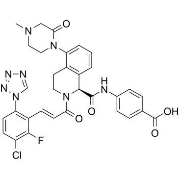 InChI=1S/C32H28ClFN8O5/c1-39-15-16-40(28(44)17-39)25-4-2-3-22-21(25)13-14-41(30(22)31(45)36-20-7-5-19(6-8-20)32(46)47)27(43)12-9-23-26(42-18-35-37-38-42)11-10-24(33)29(23)34/h2-12,18,30H,13-17H2,1H3,(H,36,45)(H,46,47)/b12-9+/t30-/m0/s1