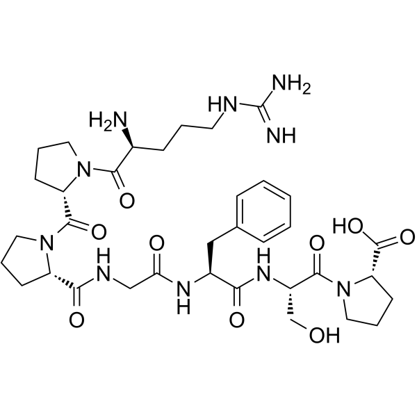 [des-Phe(8), des-Arg(9)]-缓激肽是一种七元寡肽,由Arg、Pro、Pro、Gly、Phe、Ser和Pro残基通过肽键依次连接而成。它是缓激肽的代谢产物,缺少第8位的Phe残基和第9位的Arg残基。它既是人源代谢产物,也是大鼠源代谢产物。它是[des-Phe(8), des-Arg(9)]-缓激肽(1+)的共轭碱。