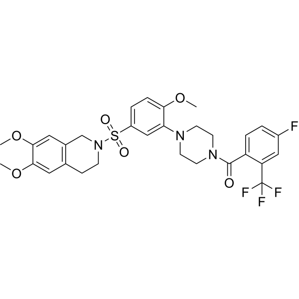 InChI=1S/C30H31F4N3O6S/c1-41-26-7-5-22(44(39,40)37-9-8-19-14-27(42-2)28(43-3)15-20(19)18-37)17-25(26)35-10-12-36(13-11-35)29(38)23-6-4-21(31)16-24(23)30(32,33)34/h4-7,14-17H,8-13,18H2,1-3H3
