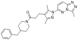 C25140; C 25140; C-25140; C25-140; C25-140; 1358099-18-9; 1-(4-Benzylpiperidin-1-yl)-3-(3,5-dimethyl-1-(3-methyl-[1,2,4]triazolo[4,3-b]pyridazin-6-yl)-1H-pyrazol-4-yl)propan-1-one; 6-{4-[3-(4-benzylpiperidin-1-yl)-3-oxopropyl]-3,5-dimethyl-1H-pyrazol-1-yl}-3-methyl[1,2,4]triazolo[4,3-b]pyridazine; 1-(4-BENZYLPIPERIDIN-1-YL)-3-(3,5-DIMETHYL-1-{3-METHYL-[1,2,4]TRIAZOLO[4,3-B]PYRIDAZIN-6-YL}-1H-PYRAZOL-4-YL)PROPAN-1-ONE; 1-(4-benzylpiperidin-1-yl)-3-[3,5-dimethyl-1-(3-methyl-[1,2,4]triazolo[4,3-b]pyridazin-6-yl)pyrazol-4-yl]propan-1-one; 1-(4-benzylpiperidin-1-yl)-3-(3,5-dimethyl-1-{3-methyl-[1,2,4]triazolo[4,3-b]pyridazin-6-yl}pyrazol-4-yl)propan-1-one; SCHEMBL19974504; C-25-140; C25 140