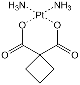 卡铂(以前称为 JM-8、CBDCA、NSC-241240;Paraplat;Paraplatin;Blastocarb;Carboplat;Carbosin;Carbosol;Carbotec;Displata;Ercar)是一种经批准的抗癌药物,通过与DNA(DNA烷基化剂)并干扰癌细胞的细胞修复机制。它用于治疗某些形式的癌症(主要是卵巢癌、肺癌、头颈癌)。它在细胞内被激活,形成反应性铂络合物,与 DNA 中富含 GC 的位点等亲核基团结合,从而诱导链内和链间 DNA 交联,以及 DNA-蛋白质交联。这些卡铂诱导的 DNA 和蛋白质效应导致细胞凋亡和细胞生长抑制。