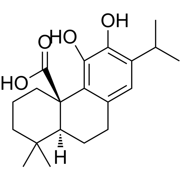 鼠尾草酸是一种枞烷二萜类化合物,其结构为枞烷-8,11,13-三烯,在11位和12位被羟基取代,20位被羧基取代。它从迷迭香(Rosmarinus officinalis)和鼠尾草(Salvia officinalis)中分离得到,具有抗血管生成、抗肿瘤、抗氧化和抗HIV活性。它可用作抗肿瘤剂、抗氧化剂、HIV蛋白酶抑制剂、血管生成调节剂、细胞凋亡诱导剂、植物代谢产物、抗炎剂和食品防腐剂。它是一种枞烷二萜类化合物、碳三环化合物、儿茶酚类化合物和单羧酸。它是鼠尾草酸的共轭酸。