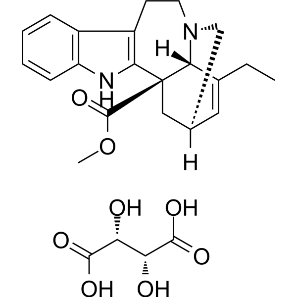 - 酒石酸长春碱的血管和心脏抑制作用是通过抑制电压门控钙通道(VOCC)介导的,从而减少Ca²⁺流入血管平滑肌细胞(舒张)和心肌细胞(降低收缩力和心率)[1] - (+)-酒石酸长春碱的抗抑郁样活性具有亚型特异性(仅(+)-对映体具有活性),并且依赖于5-羟色胺能(5-HT1A受体依赖性)和去甲肾上腺素能(α2-肾上腺素能受体依赖性)神经传递的激活[2] |