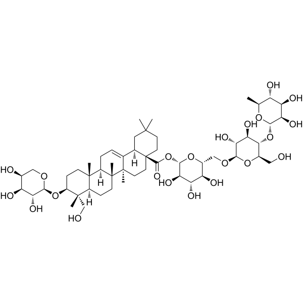 InChI=1S/C53H86O22/c1-23-32(57)35(60)39(64)45(70-23)74-42-27(19-54)71-43(41(66)37(42)62)69-21-28-34(59)36(61)40(65)46(72-28)75-47(67)53-16-14-48(2,3)18-25(53)24-8-9-30-49(4)12-11-31(73-44-38(63)33(58)26(56)20-68-44)50(5,22-55)29(49)10-13-52(30,7)51(24,6)15-17-53/h8,23,25-46,54-66H,9-22H2,1-7H3/t23-,25+,26-,27+,28+,29+,30+,31-,32-,33-,34+,35+,36-,37+,38+,39+,40+,41+,42+,43+,44-,45-,46-,49-,50-,51+,52+,53-/m0/s1