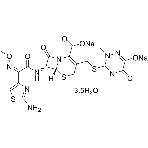 S1C([H])([H])C(C([H])([H])SC2=NC(C(=NN2C([H])([H])[H])[O-])=O)=C(C(=O)[O-])N2C([C@]([H])([C@@]12[H])N([H])C(/C(/C1=C([H])SC(N([H])[H])=N1)=N\OC([H])([H])[H])=O)=O.[Na+].[Na+].O([H])[H].O([H])[H].O([H])[H]