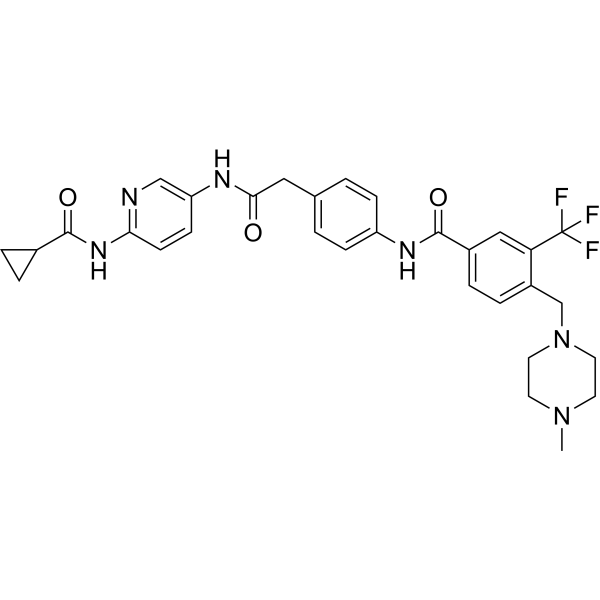 InChI=1S/C31H33F3N6O3/c1-39-12-14-40(15-13-39)19-23-7-6-22(17-26(23)31(32,33)34)30(43)37-24-8-2-20(3-9-24)16-28(41)36-25-10-11-27(35-18-25)38-29(42)21-4-5-21/h2-3,6-11,17-18,21H,4-5,12-16,19H2,1H3,(H,36,41)(H,37,43)(H,35,38,42)