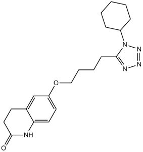 /CLINICAL TRIALS/ ClinicalTrials.gov is a registry and results database of publicly and privately supported clinical studies of human participants conducted around the world. The Web site is maintained by the National Library of Medicine (NLM) and the National Institutes of Health (NIH). Each ClinicalTrials.gov record presents summary information about a study protocol and includes the following: Disease or condition; Intervention (for example, the medical product, behavior, or procedure being studied); Title, description, and design of the study; Requirements for participation (eligibility criteria); Locations where the study is being conducted; Contact information for the study locations; and Links to relevant information on other health Web sites, such as NLM's MedlinePlus for patient health information and PubMed for citations and abstracts for scholarly articles in the field of medicine. Cilostazol is included in the database. Pletal is indicated for the reduction of symptoms of intermittent claudication, as demonstrated by an increased walking distance. /Included in US product label/ Because of its antiplatelet activity, cilostazol has been used alone or in combination with other antiplatelet agents (e.g., aspirin, clopidogrel) to prevent thrombosis and restenosis following coronary angioplasty/stent implantation. /NOT included in US product label/ Cilostazol has been used for the secondary prevention of stroke in patients with a history of noncardioembolic stroke or transient ischemic attacks (TIAs). /NOT included in US product label/ /EXPL THER/ We conducted a randomized, double blind, placebo controlled trial to assess the efficacy and safety of cilostazol, a selective inhibitor of phosphodiesterase 3, in patients with vasospastic angina (VSA). Cilostazol has been shown to induce vascular dilatation, but its efficacy in patients with VSA is unknown. Between October 2011 and July 2012, 50 patients with confirmed VSA who had >/= 1 angina episodes/week despite amlodipine therapy (5 mg/day) were randomly assigned to receive either cilostazol (up to 200 mg/day) or placebo for 4 weeks. All patients were given diaries to record the frequency and severity of chest pain (0-10 grading). The primary endpoint was the relative reduction of the weekly incidence of chest pain. Baseline characteristics were similar between the two groups. Among 49 evaluable patients (25 in the cilostazol group, 24 in the placebo group), the primary endpoint was significantly greater in the cilostazol group compared with the placebo group (-66.5 +/- 88.6% vs -17.6 +/- 140.1%, respectively, p=0.009). The secondary endpoints, including a change in the frequency of chest pain (-3.7 +/- 0.5 vs -1.9 +/- 0.6, respectively, p=0.029), a change in the chest pain severity scale (-2.8 +/- 0.4 vs -1.1 +/- 0.4, respectively, p=0.003), and the proportion of chest pain-free patients (76.0% vs 33.3%, respectively, p=0.003) also significantly favoured cilostazol. Headache was the most common adverse event in both groups (40.0% vs 20.8%, respectively, p=0.217). Cilostazol is an effective therapy for patients with VSA uncontrolled by conventional amlodipine therapy, and has no serious side effects. Drug Warnings /BOXED WARNING/ WARNING: CONTRAINDICATED IN HEART FAILURE PATIENTS. Pletal is contraindicated in patients with heart failure of any severity. Cilostazol and several of its metabolites are inhibitors of phosphodiesterase III. Several drugs with this pharmacologic effect have caused decreased survival compared to placebo in patients with class III-IV heart failure. Rare cases of thrombocytopenia or leukopenia progressing to agranulocytosis have been reported when cilostazol was not immediately discontinued; agranulocytosis was reversible with discontinuance of cilostazol. Information is limited regarding the safety and efficacy of concurrent use of cilostazol and clopidogrel. Currently it is unknown whether concurrent therapy with cilostazol and clopidogrel has additive effects on bleeding time. Caution should be used and bleeding times monitored during such concurrent therapy. Cilostazol may induce tachycardia, palpitation, tachyarrhythmia or hypotension. The increase in heart rate associated with cilostazol is approximately 5 to 7 bpm. Patients with a history of ischemic heart disease may be at risk for exacerbations of angina pectoris or myocardial infarction. For more Drug Warnings (Complete) data for Cilostazol (10 total), please visit the HSDB record page. Pharmacodynamics Cilostazol reduces the symptoms of intermittent claudication, as indicated by an increased walking distance. Intermittent claudication is pain in the legs that occurs with walking and disappears with rest. The pain occurs due to reduced blood flow to the legs. Mechanism of action: Cilostazol exerts its pharmacological effects by inhibiting PDE3, which leads to increased intracellular cAMP levels. Elevated cAMP activates protein kinase A (PKA), which in turn phosphorylates downstream targets: in platelets, this inhibits aggregation; in vascular smooth muscle cells, this induces relaxation (vasodilation); in proliferative cells (e.g., HSCs, vascular smooth muscle cells), this suppresses proliferation and migration. [1, 3, 4] - Therapeutic indications: Cilostazol is approved for the treatment of intermittent claudication (a symptom of peripheral arterial disease) in humans, as it improves walking distance by enhancing blood flow and reducing platelet aggregation. It is also being investigated for the prevention of stroke recurrence and the treatment of other vascular diseases (e.g., restenosis after angioplasty). [1] - Selectivity: Compared to other PDE3 inhibitors (e.g., milrinone), Cilostazol has higher selectivity for PDE3 over other PDE isoforms, which reduces the risk of off-target effects (e.g., cardiac arrhythmias associated with PDE5 inhibition). [1] - Effect on hepatic fibrosis: Cilostazol attenuates liver fibrosis not only by inhibiting HSC ac