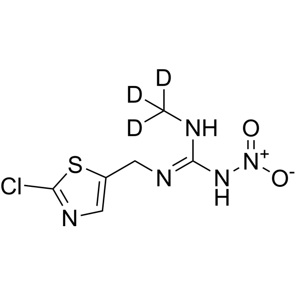 对于分离的神经元,clothianidin-d3 (30 nM) 显示出显着的作用 [3]。暴露于马利筋(1 µg/L;36 小时)的帝王蝶幼虫表现出噻虫胺-d3 的亚致死作用 [4]。种植玉米和大豆的田地的土壤和水中含有少量的噻虫胺-d3(0.25 毫克/粒和 0.50 毫克/粒)[5]。