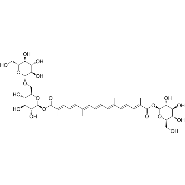 据报道,栀子(Gardenia jasminoides)和番红花(Crocus sativus)中含有藏红花酸龙胆二糖基葡萄糖酯,并有相关数据。 - 藏红花素II是从加工过的栀子(Gardenia jasminoides)中分离得到的藏红花酸衍生物,栀子是一种传统中药,因其抗炎特性而被广泛应用[1]。 - 藏红花素II的抗炎机制涉及抑制NF-κB信号通路,从而进一步降低促炎酶(iNOS、COX-2)和细胞因子(TNF-α、IL-1β)的表达[1]。 |