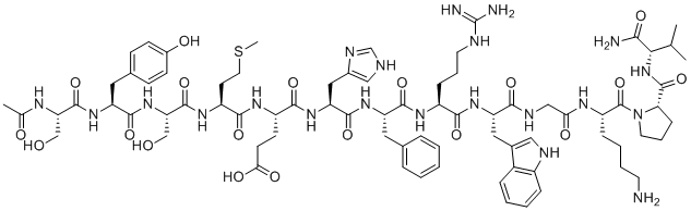 α-促黑素细胞激素(α-MSH)是一种由13个氨基酸组成的肽类激素,其结构单元依次为N-乙酰-L-丝氨酸(N-acetyl-L-Ser)、L-酪氨酸(L-Tyr)、L-丝氨酸(L-Ser)、L-蛋氨酸(L-Met)、L-谷氨酸(L-Glu)、L-组氨酸(L-His)、L-苯丙氨酸(L-Phe)、L-精氨酸(L-Arg)、L-色氨酸(L-Trp)、甘氨酸(Gly)、L-赖氨酸(L-Lys)、L-脯氨酸(L-Pro)和L-缬氨酰胺,这些单元通过肽键连接。α-MSH是一种内源性黑素皮质素受体激动剂,具有抗炎活性。它是一种抗炎剂。α-MSH是由促肾上腺皮质激素(ACTH)的N端片段经蛋白水解切割而产生的13个氨基酸肽。ACTH(1-13)在C端酰胺化形成ACTH(1-13)NH2,后者在分泌颗粒中进一步乙酰化形成α-MSH。 α-MSH 刺激哺乳动物黑素细胞和低等脊椎动物黑素细胞中黑色素的合成和分布。