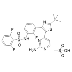 Dabrafenib Mesylate is the mesylate salt form of dabrafenib, an orally bioavailable inhibitor of B-raf (BRAF) protein with potential antineoplastic activity. Dabrafenib selectively binds to and inhibits the activity of B-raf, which may inhibit the proliferation of tumor cells which contain a mutated BRAF gene. B-raf belongs to the raf/mil family of serine/threonine protein kinases and plays a role in regulating the MAP kinase/ERKs signaling pathway, which may be constitutively activated due to BRAF gene mutations. See also: Dabrafenib (has active moiety). Drug Indication Treatment of melanoma, Treatment of solid malignant tumours (excluding melanoma) Pharmacodynamics Dabrafenib is a kinase inhibitor that is mainly used to target BRAF V600E mutation in multiple types of cancer. Although dabrafenib and [trametinib] both inhibit the RAS/RAF/MEK/ERK pathway, they inhibit different effectors of the pathway, thus increasing response rate and mitigating resistance without cumulative toxicity. The melanoma approval for use with [trametinib] is based on results from COMBI-AD, a Phase III study of 870 patients with Stage III BRAF V600E/K mutation-positive melanoma treated with dabrafenib + trametinib after complete surgical resection. Patients received doses of dabrafenib (150 mg BID) + trametinib (2 mg QD) combination (n = 438) or matching placebos (n = 432). After a median follow-up of 2.8 years, the primary endpoint of relapse-free survival (RFS) was met. In the case of thyroid cancer, Dabrafenib plus Trametinib is the first regimen demonstrated to have potent clinical activity in BRAF V600E–mutated anaplastic thyroid cancer and is well tolerated. These findings represent a meaningful therapeutic advance for this orphan disease. Dabrafenib is an organofluorine compound and antineoplastic agent, used as its mesylate salt in treatment of metastatic melanoma. It has a role as an antineoplastic agent, a B-Raf inhibitor and an anticoronaviral agent. It is a sulfonamide, an organofluorine compound, a member of 1,3-thiazoles and an aminopyrimidine. Dabrafenib mesylate (Tafinlar) is a reversible ATP-competitive kinase inhibitor and targets the MAPK pathway. It was approved on May 29, 2013, for the treatment of melanoma with V600E or V6000K mutation. It was also used for metastatic non-small cell lung cancer with the same mutation. In May 2018, Tafinlar (dabrafenib), in combination with Mekinist ([DB08911]), was approved to treat anaplastic thyroid cancer caused by an abnormal BRAF V600E gene. Dabrafenib is a Kinase Inhibitor. The mechanism of action of dabrafenib is as a Protein Kinase Inhibitor, and Cytochrome P450 3A4 Inducer, and Cytochrome P450 2B6 Inducer, and Cytochrome P450 2C8 Inducer, and Cytochrome P450 2C9 Inducer, and Cytochrome P450 2C19 Inducer, and Organic Anion Transporting Polypeptide 1B1 Inhibitor, and Organic Anion Transporting Polypeptide 1B3 Inhibitor, and Organic Anion Transporter 1 Inhibitor, and Organic Anion Transporter 3 Inhibitor, and Breast Cancer Resistance Protein Inhibitor. Dabrafenib is a selective inhibitor of mutated forms of BRAF kinase and is used alone or in combination with trametinib in the treatment of advanced malignant melanoma. Dabrafenib therapy is associated with transient elevations in serum aminotransferase during therapy, but has not been linked to instances of clinically apparent acute liver injury. Dabrafenib is an orally bioavailable inhibitor of B-raf (BRAF) protein with potential antineoplastic activity. Dabrafenib selectively binds to and inhibits the activity of B-raf, which may inhibit the proliferation of tumor cells which contain a mutated BRAF gene. B-raf belongs to the raf/mil family of serine/threonine protein kinases and plays a role in regulating the MAP kinase/ERKs signaling pathway, which may be constitutively activated due to BRAF gene mutations. DABRAFENIB is a small molecule drug with a maximum clinical trial phase of IV (across all indications) that was first approved in 2013 and has 7 approved and 19 investigational indications. Activation of the Ras‐Raf‐MEK‐ERK pathway has been implicated in a large range of human cancers. Growth factor receptor stimulation by extracellular ligands activates Ras, which then sets in motion a signal transduction cascade through the Raf, MEK and ERK serine/threonine kinases. Mutation of the B‐Raf kinase constitutively activates MAPK signalling, thus bypassing the need for upstream stimuli. This has been genetically associated with several human cancers, especially occurrence of the B‐RafV600E mutant and its high prevalence in melanoma, colorectal carcinoma, ovarian cancer, papillary thyroid carcinoma, and cholangiocarcinoma. The ability to selectively and potently inhibit B‐Raf should provide a potential therapy for patients with mutant B‐Raf tumors, for which addictive dependency on this pathway is observed. We have identified a novel, potent, and selective Raf kinase inhibitor that is capable of inhibiting the kinase activity of wild‐type B‐Raf, B‐RafV600E and c‐Raf with IC50 values of 3.2, 0.8, and 5.0 nM, respectively. Kinase panel screening for over 270 kinases has indicated that this inhibitor is selective for Raf kinase, with ∼400 fold selectivity towards B‐Raf over 91% of the other kinases tested. Specific cellular inhibition of B‐RafV600E kinase by this inhibitor leads to decreased ERK phosphorylation and inhibition of cell proliferation by an initial arrest in the G1 phase of the cell cycle, followed by cell death. This inhibition is selective for cancer cells that specifically encode the mutation for B‐RafV600E. Oral compound administration inhibits the growth of B‐RafV600E mutant melanoma (A375P) and colon cancer (Colo205) human tumor xenografts, growing subcutaneously in immuno‐compromised mice. This cell‐specific B‐RafV600E inhibitor is currently being evaluated in a human Phase I clinical trial. Citation Information: Mol Cancer Ther 2009;8(12 Suppl