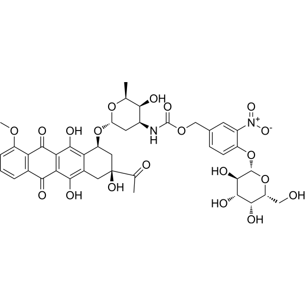 C[C@H]1[C@H]([C@H](C[C@@H](O1)O[C@H]2C[C@@](CC3=C2C(=C4C(=C3O)C(=O)C5=C(C4=O)C(=CC=C5)OC)O)(C(=O)C)O)NC(=O)OCC6=CC(=C(C=C6)O[C@H]7[C@@H]([C@H]([C@H]([C@H](O7)CO)O)O)O)[N+](=O)[O-])O