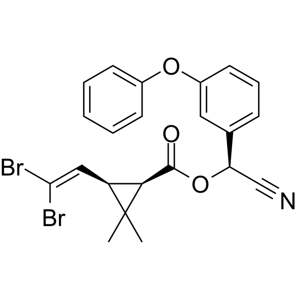 溴氰菊酯是一种环丙烷羧酸酯,由3-(2,2-二溴乙烯基)-2,2-二甲基环丙烷羧酸与氰基(3-苯氧基苯基)甲醇缩合而成。它是前体杀虫剂溴氰菊酯的活性杀虫剂。它具有多种功能,包括拟除虫菊酯类杀虫剂、农用化学品、EC 3.1.3.16(磷蛋白磷酸酶)抑制剂、钙通道激动剂和拒食剂。它是一种芳香醚、有机溴化合物、腈和环丙烷羧酸酯。其结构与顺式-3-(2,2-二溴乙烯基)-2,2-二甲基环丙烷羧酸相关。