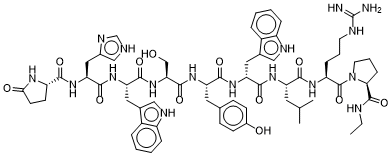 醋酸地洛瑞林是一种注射用促性腺激素释放激素超激动剂,也称为 LHRH 激动剂。它能抑制性激素的产生。 地洛瑞林是天然促性腺激素释放激素 (GnRH) 的合成九肽类似物,具有潜在的抗肿瘤活性。地洛瑞林与垂体促性腺激素释放激素 (GnRH) 受体结合并激活它们。男性长期持续使用戈舍瑞林会导致垂体 GnRH 受体脱敏,并抑制垂体分泌卵泡刺激素 (FSH) 和黄体生成素 (LH),从而导致睾酮水平显著下降;女性长期使用会导致雌二醇水平下降。(NCI04) 另见:醋酸地洛瑞林(有盐形式);地洛瑞林;醋酸地洛瑞林(成分)。 |