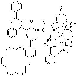 Drug Indications Investigations are underway for the treatment of breast cancer, colorectal cancer, gastric cancer, kidney cancer, lung cancer, pancreatic cancer, prostate cancer, and skin cancer. Mechanism of Action DHA-paclitaxel is a prodrug composed of the naturally occurring omega-3 fatty acid docosahexaenoic acid (DHA) covalently bound to the antimicrotubule drug paclitaxel. Since tumor cells absorb DHA, DHA-paclitaxel can be directly delivered to tumor tissue. Paclitaxel partially binds to tubulin, inhibiting microtubule depolymerization and thus suppressing cell division. Paclitaxel can also induce apoptosis by binding to and blocking the function of the apoptosis-inhibiting protein Bcl-2 (B-cell leukemia 2). Compared to conventional paclitaxel, DHA-paclitaxel exhibits superior pharmacokinetic and toxicological characteristics and has shown antitumor activity in animal cancer models. |