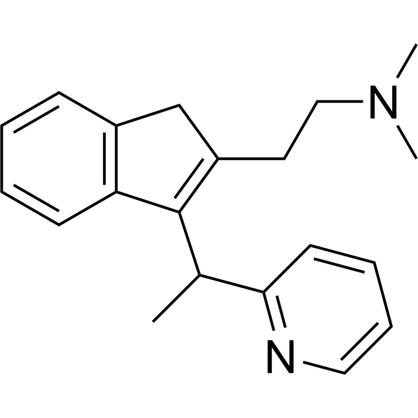 Dimetindene (Fenistil) is an antihistamine/anticholinergic used orally and locally as an antipruritic. A histamine H1 antagonist. It is used in hypersensitivity reactions, in rhinitis, for pruritus, and in some common cold remedies. Drug Indication Indicated as symptomatic treatment of allergic reactions: urticaria, allergies of the upper respiratory tract such as hey fever and perennial rhinitis, food and drug allergies; pruritus of various origins, except pruritus due to cholestasis; insect bites. Dimethindene is also indicated for pruritus in eruptive skin diseases such as chicken-pox. Dimethindene can also be used as an adjuvant in eczema and other pruriginous dermatoses of allergic origin. Mechanism of Action Dimethindene is a selective histamine H1 antagonist and binds to the histamine H1 receptor. This blocks the action of endogenous histamine, which subsequently leads to temporary relief of the negative symptoms brought on by histamine. Pharmacodynamics Dimethindene occurs as a racemic mixture. The (S)-(+)-dimethindene is a potent M2-selective muscarinic receptor antagonist (with lower affinity for M1, M3, and M4 muscarinic receptors). The (R)-(-)-enantiomer is the eutomer (responsible for bioactivity) for histamine H1 receptor binding. |